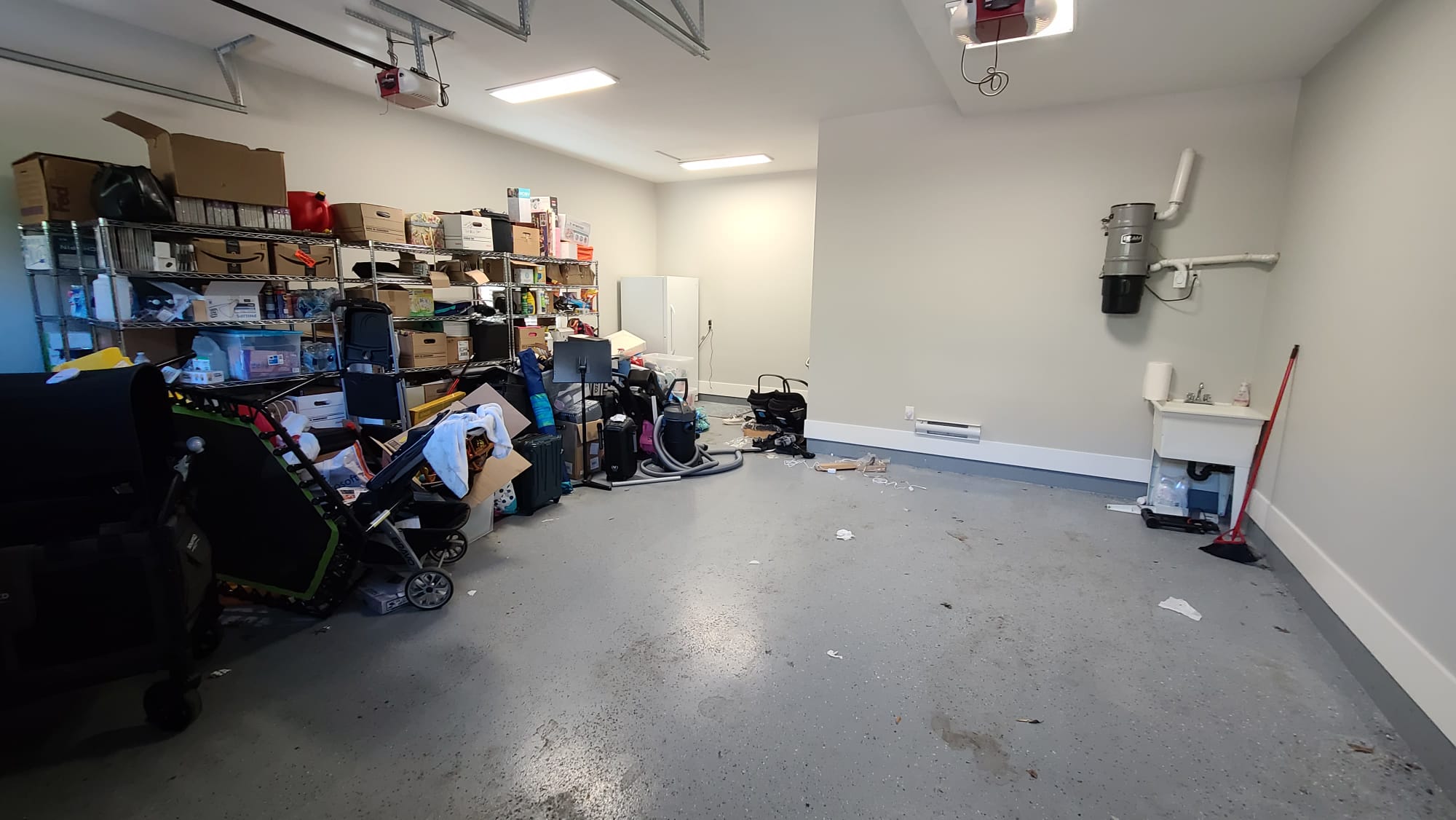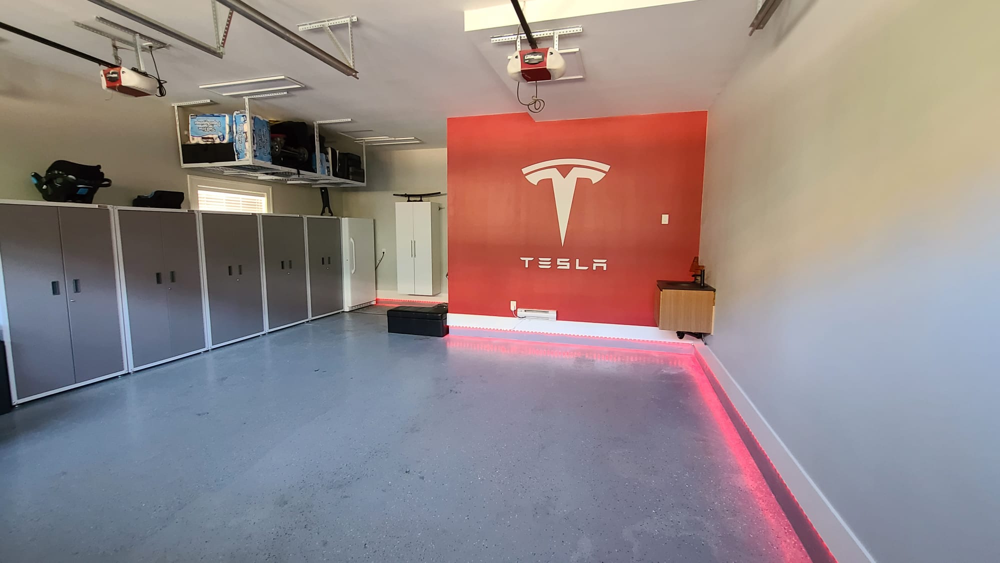Here we installed a roof rack, 5 free standing cabinets, a shoe cabinet, a free floating sink, and painted a feature wall to showcase the owner’s Tesla. The owners needed to both park their car while also ensuring their belongings were neatly stored away without it being an eye-sore.